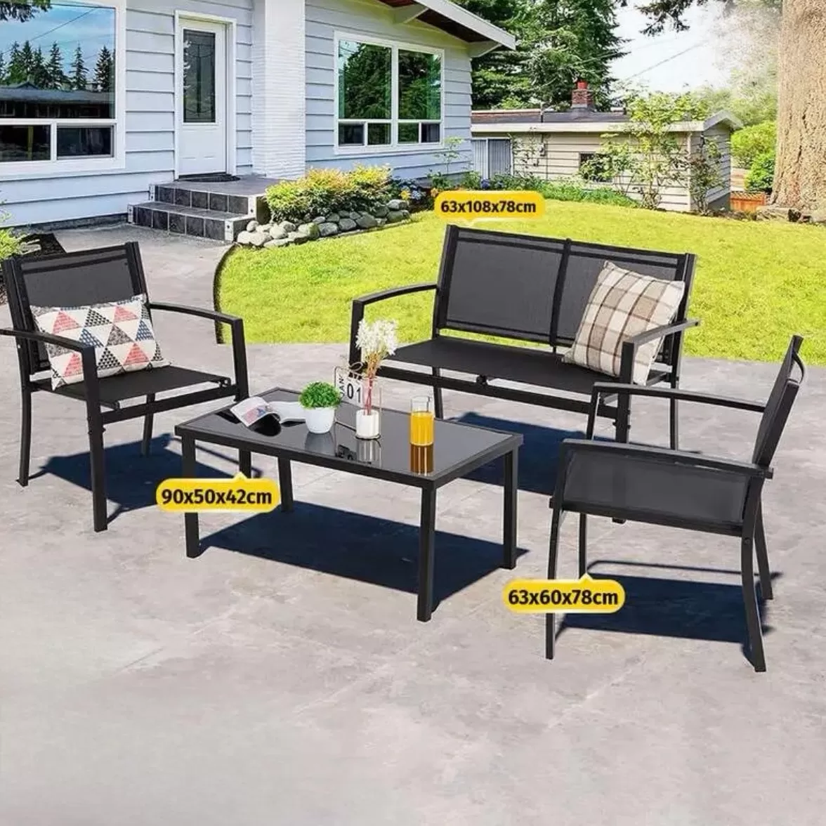 Компактен и елегантен градинарски сет кој содржи маса, двосед и две столици – идеален за балкони, тераси или дворови. Изработен од метална конструкција, текстилен материјал и стаклена површина на масата, нуди удобност и издржливост за секојдневна употреба на отворено.