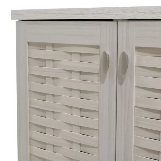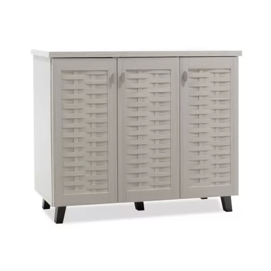 Конструкција од висококвалитетна оплеменета иверица. Вклучува два шкафови со по три прегради. Капацитет: 16 пара обувки. Боја: бело-сива.