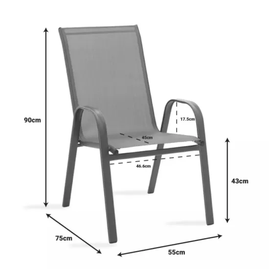Модерен и удобен градински стол со цврста метална конструкција и мрежесто седиште за пријатно седење. Отпорен на надворешни услови и лесен за одржување, идеален за двор, тераса или балкон. Минималистичкиот дизајн овозможува лесно вклопување во секој надворешен простор.