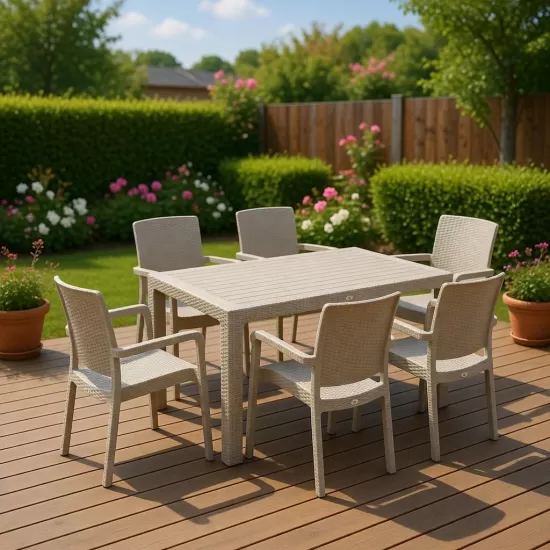 HOLIDAY Сет Маса 150х90 см + 6 столици раттан КРЕМ